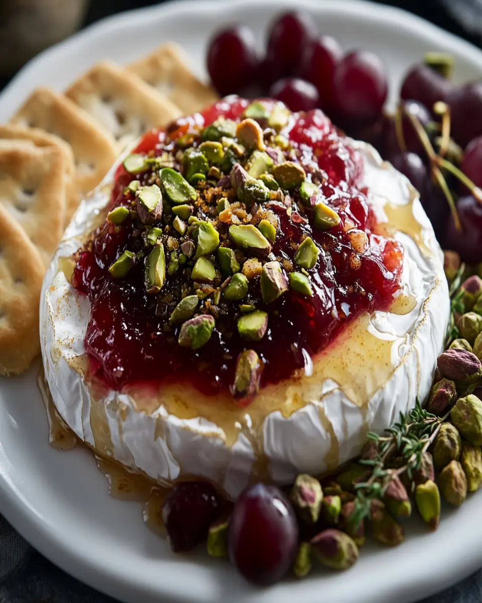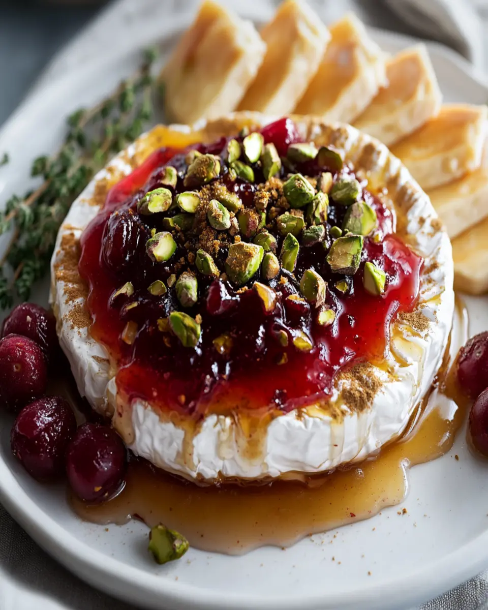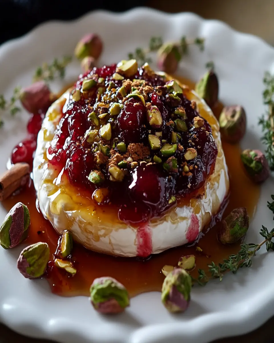 A delicious and elegant appetizer featuring baked brie topped with cherry jam, pistachios, cinnamon, and honey.