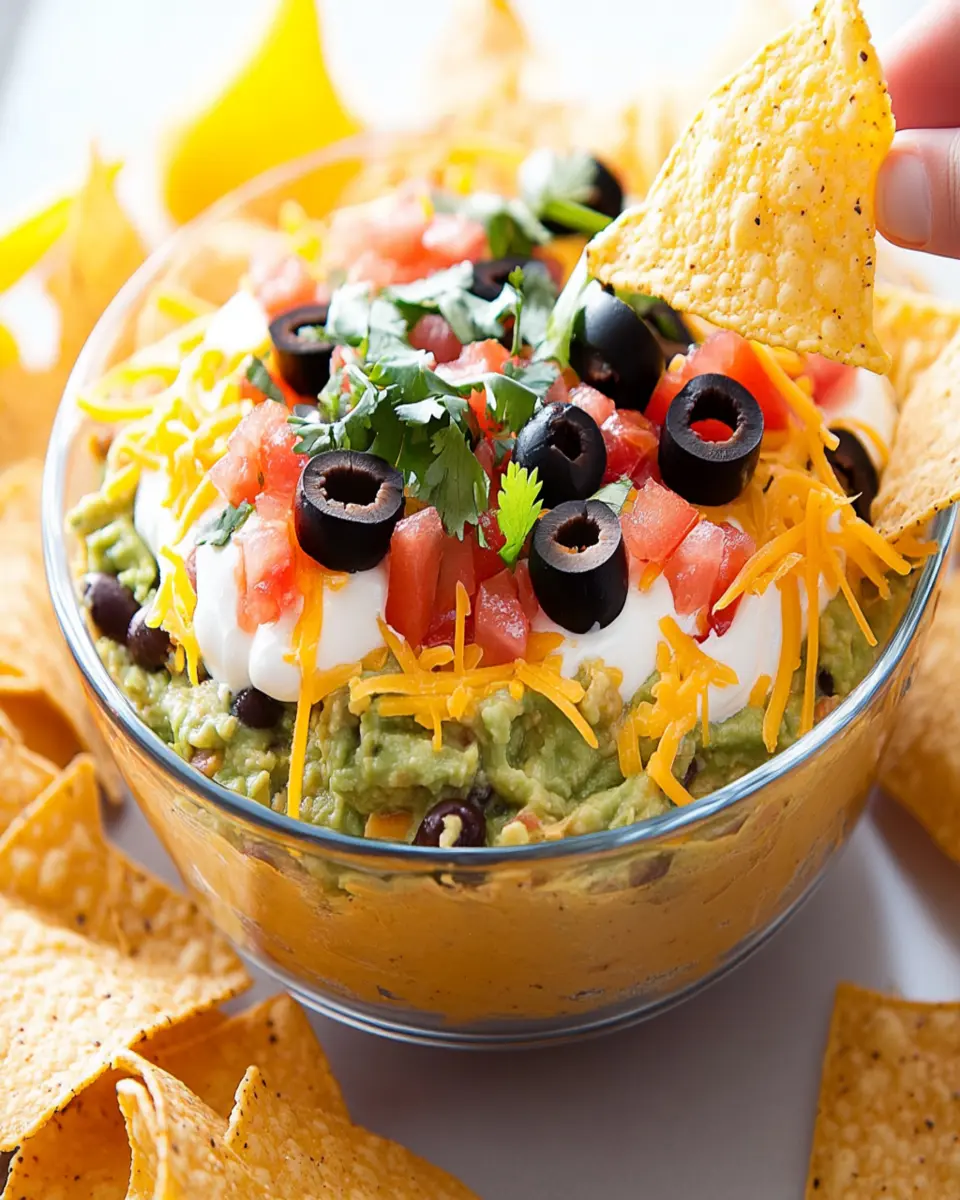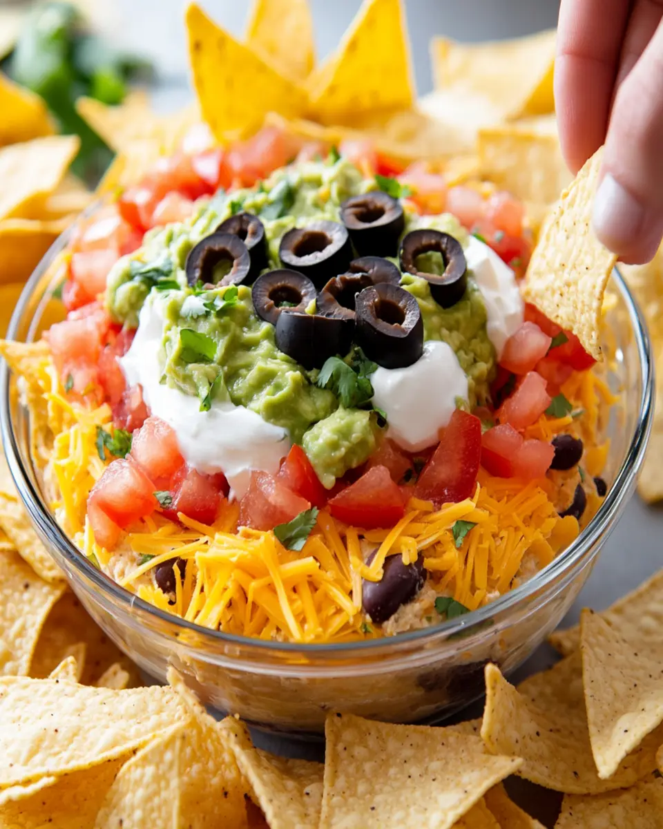 This dip combines the rich creaminess of sour cream and guacamole with the hearty texture of refried beans. Topped with fresh salsa, shredded cheddar cheese, and vibrant vegetables like black olives and green onions, it’s a feast for the eyes and the taste buds. Whether you’re hosting a gathering or simply enjoying a quiet evening at home, this dip is sure to impress.