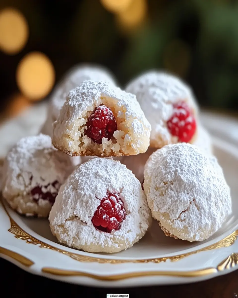 Delicious snowball cookies, combining the flavors of raspberry and almond for a perfect treat.