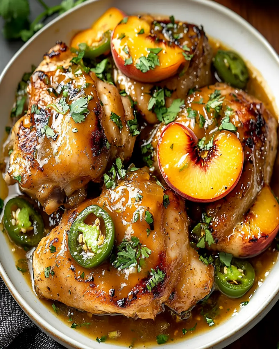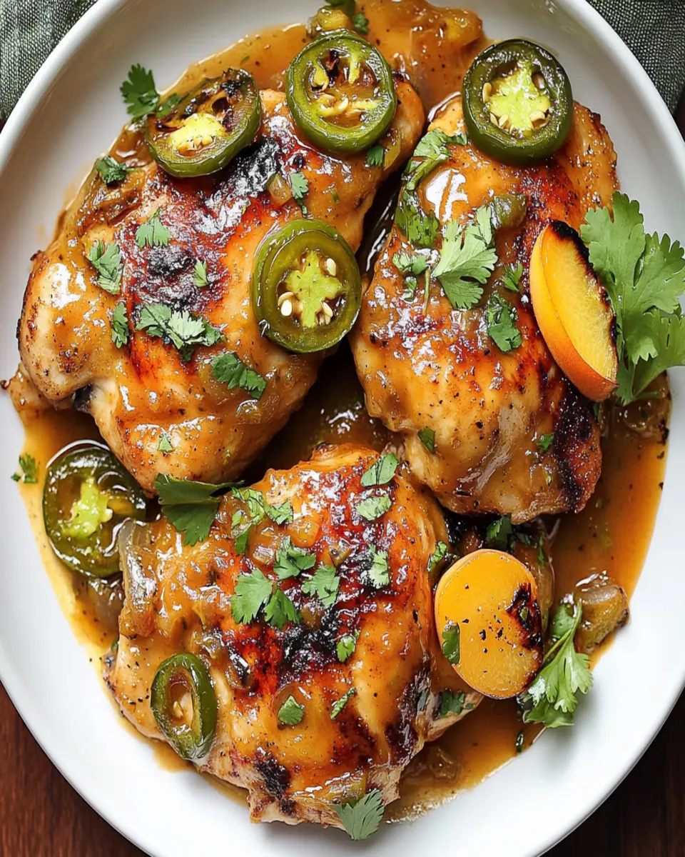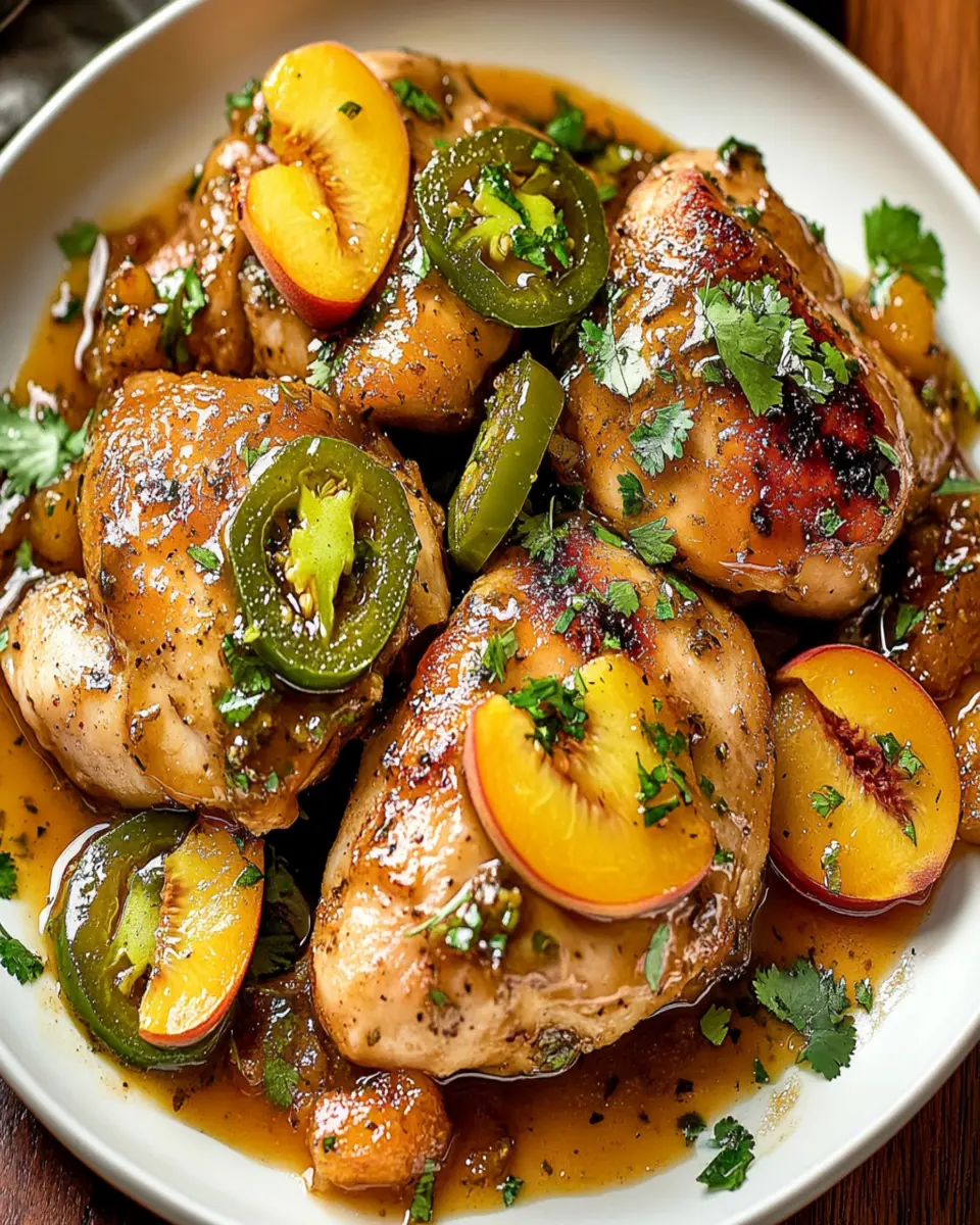 A deliciously spicy and sweet chicken dish combining the flavors of jalapenos and peaches.