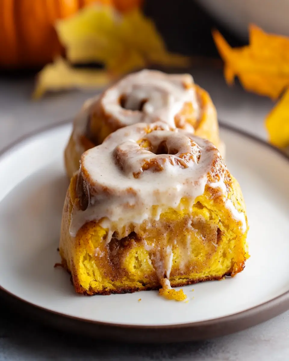 Delicious and indulgent pumpkin cinnamon rolls topped with a sweet glaze, perfect for breakfast or dessert.