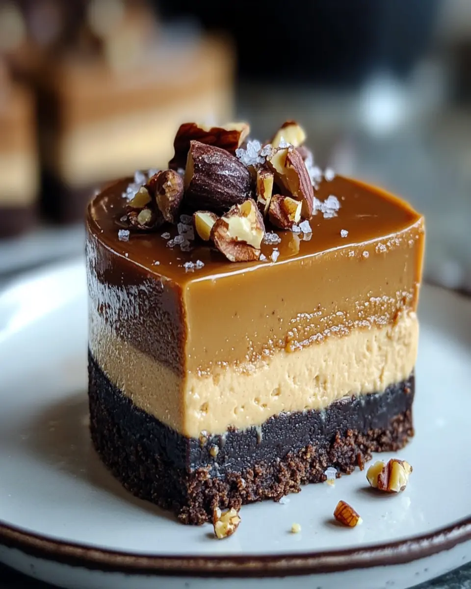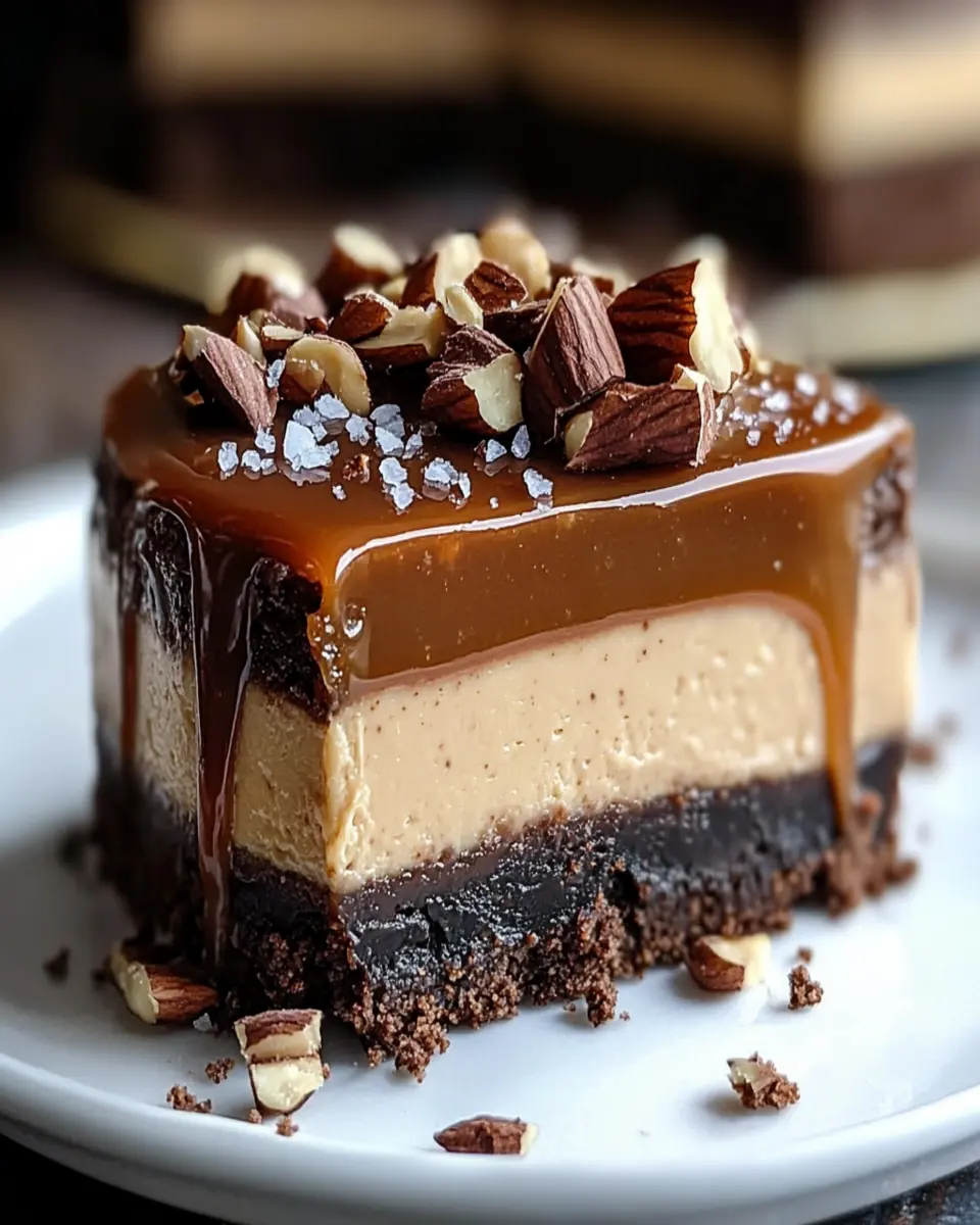 A decadent dessert combining the richness of a brownie, the creaminess of cheesecake, and the sweetness of caramel.
